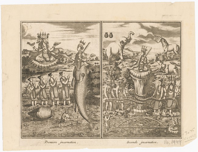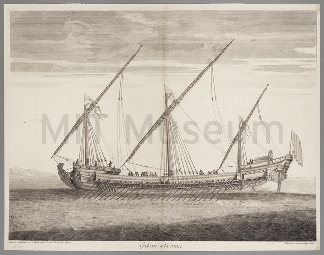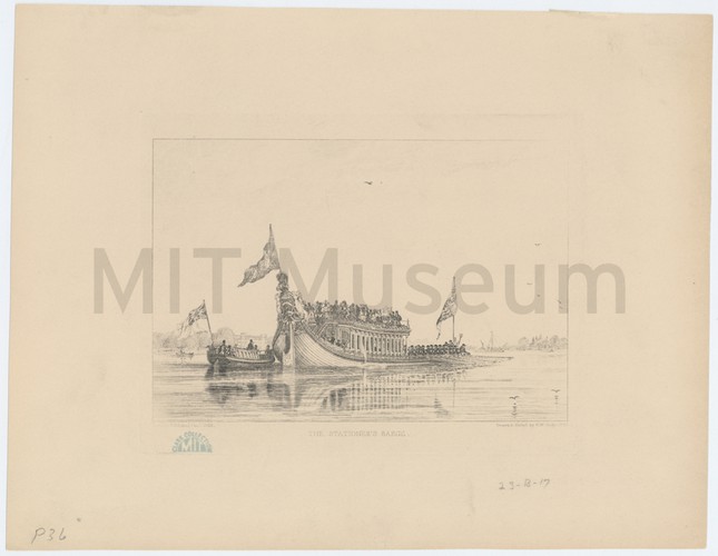 Hand-colored lithograph depicting a man astride a porpoise, with a green devil suspended by a parachute "flying" beside him and a city being bombed by ships in the background at left. Title and production information in lower margin.