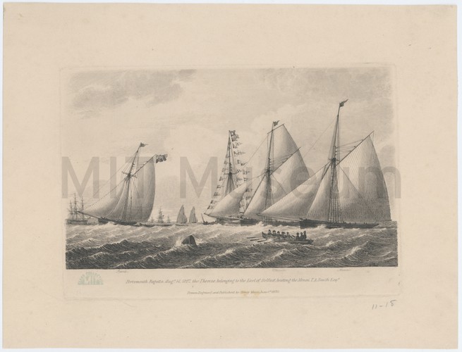 Etching depicting a three-quarters stern view of a fishing vessel, with men pulling in nets, at sea. With title, "D", and "12" printed in lower margin. The letter refers to the number of the volume of Groenewegen's works, and the number to its position in that volume.