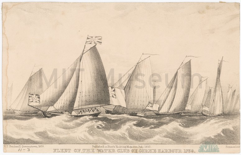Etching depicting a three-quarters stern view of a single-masted vessel at sea. With title, "D" , and "11" printed in lower margin. The letter refers to the number of the volume of Groenewegen's works, and the number to its position in that volume.