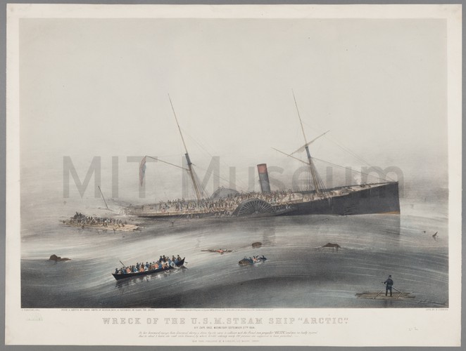A colored lithograph of the port-side view of the American schooner yacht 'Sappho' of the New York Yacht Club. She was one of two defender yachts at the second America's Cup challenge. She flies the American Yacht Ensign. Other sailing vessels and a red and white striped lighthouse are in the background.