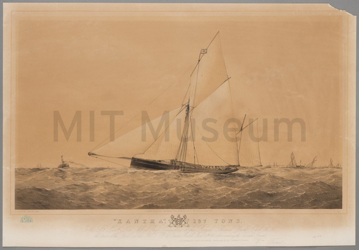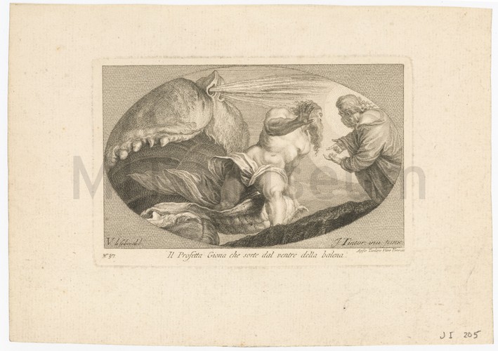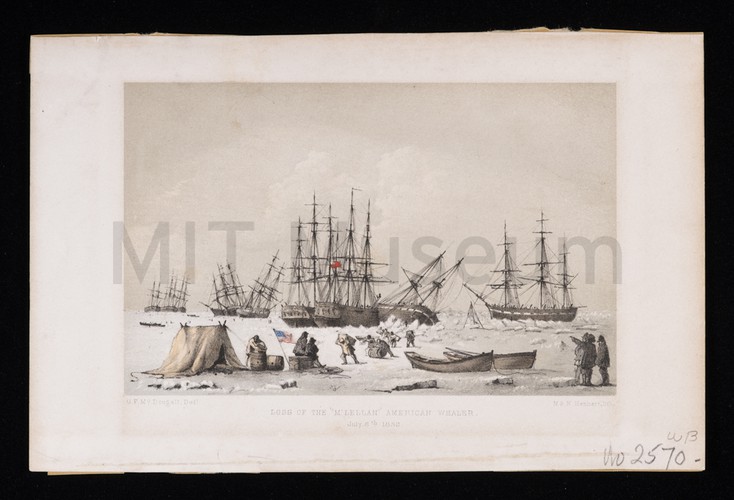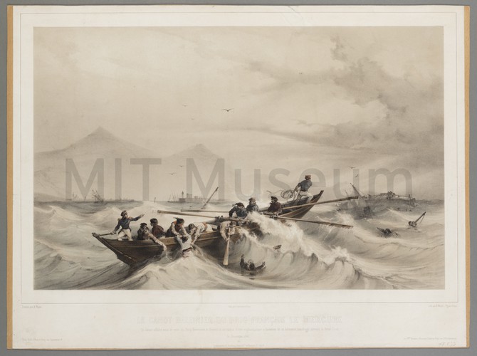 Hand-colored engraving depicting nine whaling, sailing, and lifesaving scenes centered around a vignette of men in a rowboat at sea. Each image is numbered; numbers correspond to a caption in German in the lower margin. Below is printed the production information.