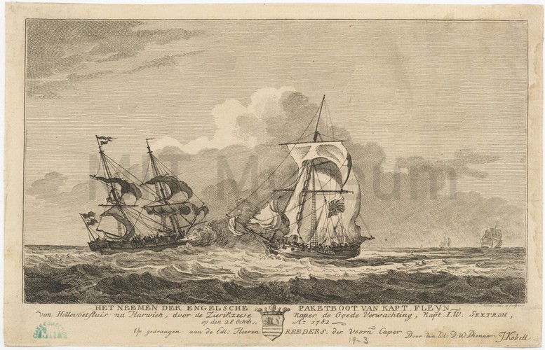 Hand-colored illustration showing a spouting sperm whale flicking its tail, and a man thrown up into his hair, his hat falling from his head, with a whaleboat nearby, and broken spars in the foreground. There is a whaling ship on the horizon. Caption reads "'Sent the principal man in the boat flying into the air.' P.126."