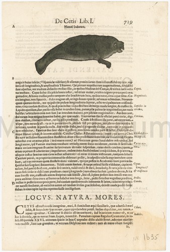 Colored engraving of a beached whale with a pink underbelly. A seabird stands to its left. In the background are a number of ships with sails and rowboats driving a large group of whales towards the shore on the right-hand side of the print, where a number of men, represented by stick figures, are shown rushing towards the whales. Below the image is printed, "Shetland Whale Hunt."
