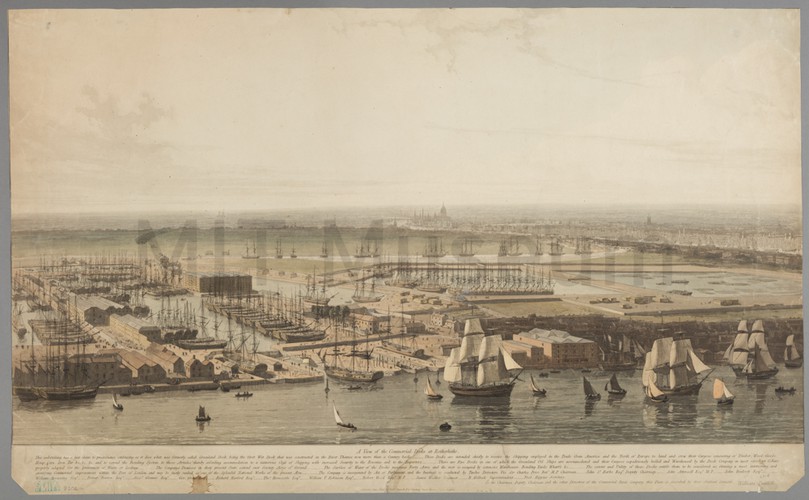 Monochrome photograph of a print. The print depicts a steam-powered boat flying the American flag and another flag marked "T", tugging a large three-masted ship (also flying the American flag) behind it. At bottom is the text, "COPYRIGHT 1910 by James Walter Folger". It is unclear what process was used to make the print. Below the image is printed, "SHIP CITIZEN (LAST WHALER IN CAMEL)"
