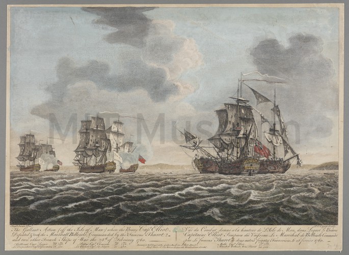 Two ships at the end of a battle, the French frigate flying the tricolor at the right, the British ship dismasted at the left, with a rowing boat passing from one to the other. On her second voyage for China as an East Indiaman under the command of Captain Thomas Larkins, the French frigate 'Pi̩montaise' captured her after four hours of resistance. The French subsequently used her as a prison ship then sold her to a Danish company before she was recaptured by the British around 1807.