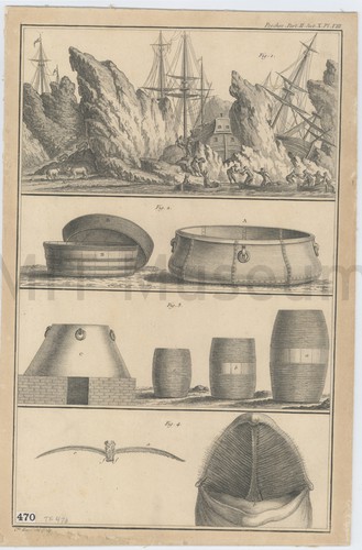 A sperm whale flounders in agony as it is being harpooned by a whale boat's crewman. The movement of the whale almost tips over another whale boat and one of the crew members is about to fall into the water. In the distance on the right, the main whaling vessel is visible. In the distant on the left, a whale boat has already attached itself to the whale and is following the animal by the rope attached to the harpoon.