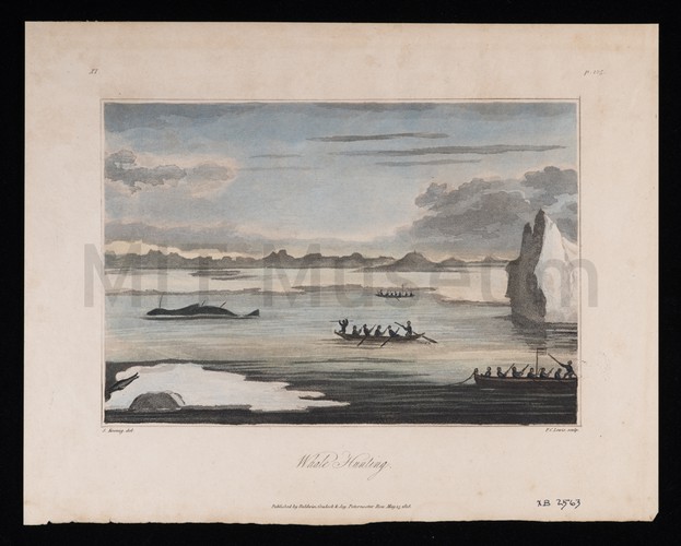 Book page with hand colored illustrations of cetaceans. Includes a porpoise skeleton, skull details of dolphins, narwhals, and porpoises, a diagram of the vascular system of the whale, and two side views of first the porpoise, and second, the narwhal; with a whaling scene showing a man in a kayak about to spear the narwhal swimming under the prow of his vessel. This last image has been cut out and then reattached using linen tape on the mounting of the object.