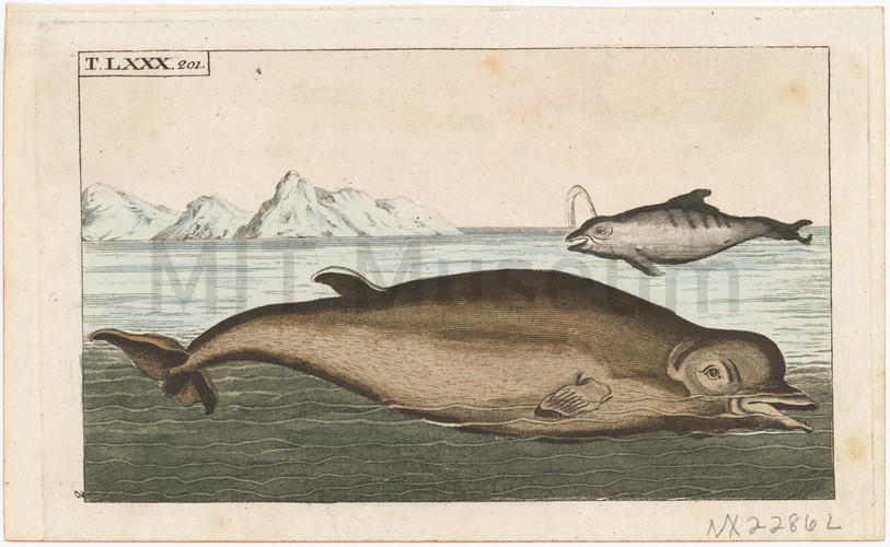 Black and white diagram engraving of species and parts of whales. Depicted are: (1) sideview of a Balaenoptera and its pointed snout; (2) underside view of a Balaenoptera; (3) underside view of a Balaenoptera's upper jaw and pointed snout; (4) baleen (whalebone). Lettered with captions and "1. Baleinopt̬re Museau-pointu, Vue par c̫t̩. 2. Baleinopt̬re Museau-pointu, Vue par dessous. 3. Machoire sup̩rierede la Baleinopt̬re museau-pointu, Vue par dessous. 4. Fanon. Pl. 8. Page 134. Bigant. S."