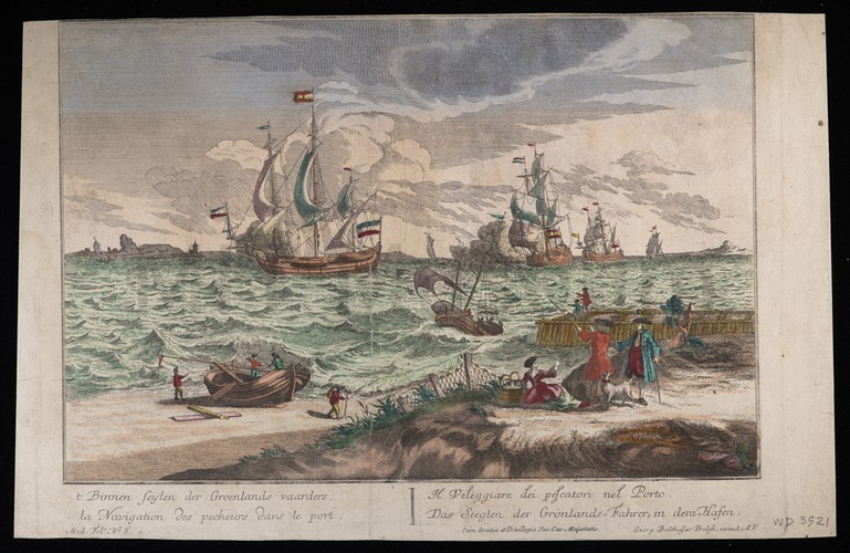 A colored etching of the three-quarter stern and starboard-side view of the ship model of the man of war, 'Valiant.' The vessel stands on its keel on top of a black, short-footed pedestal. The hull model is ornately decorated and includes the detail of the cutouts of the poop deck railings. The rudder and the two-floored gallery are prominently visible. The rigging, sails, and the entirety of the masts are not included. The masts are depicted as if they were broken.