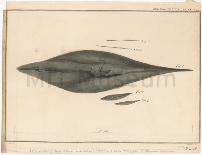 Monochrome engraving depicting a whale stranding, with many men and women on a beach looking at the stranded male whale. Two men stand atop its body. Two greyhounds in the foreground. Some tents are set up in the background, and there are single-masted ships on the sea. At bottom, a stylized title, with the text: "Anno 1614 28 December is gestrant desen vis lanck synde 58 voeten. F.V. Wilde fe." (In the year of 1614, on 28 December, this 58-foot-long fish was stranded. Made by F. V. Wilde.)