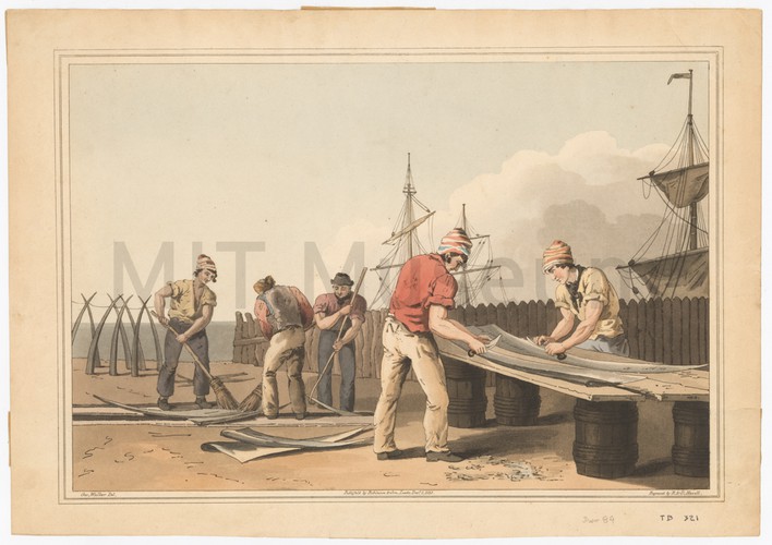 The paper is foxed and becoming brittle, although tape has been applied in places on the back to protect the edges. The print depicts men measuring as stranded whale on a beach. The latin text at bottom describes the scene and details the ugliness of the whale.