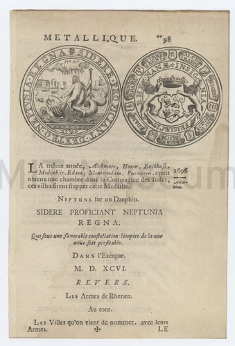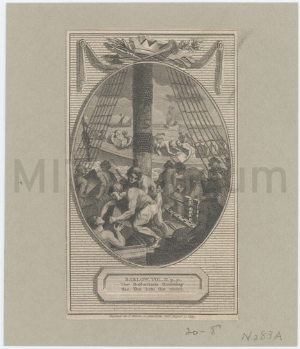 Engraving of a Roman or Greek seal with an image of Triton, represented with his characteristic symbols, the trident and twisted shell. Above and below the representation of the seal are printed "Tab. XXVIII" and "Triton". This is surrounded by a large, ornate border printed from a separate block with red ink, or with ink that has discolored to red. At the base of this border are the artist attributions.