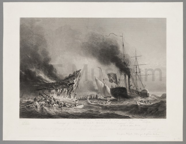 A sepia photo-processed print of a painting of the steamship 'Indiana' by Samuel Walters. The steamship sails towards the right side of the print with all sails set and passengers on the front deck.