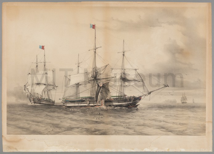 A photo reproduction after the painting of the view of the brig 'Antelope' in Boston Harbor by Henry Fitz Lane. She flies signals at the top of her mainmast and an American flag at her stern. One of the men in the rowboat in the right foreground points at the brig. The 'Antelope' was built for the opium trade and spent her entire career smuggling opium into China.