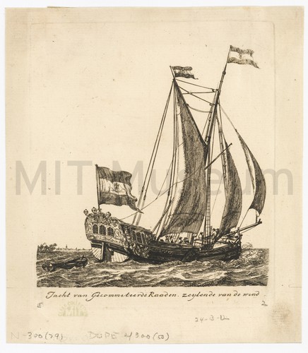 Etching depicting a side view of the sloop of war "Columbine", flying a British naval jack, with other vessels and a landmass in the background. Title and production information printed in lower margin. "Pl. 5" in lower left corner.