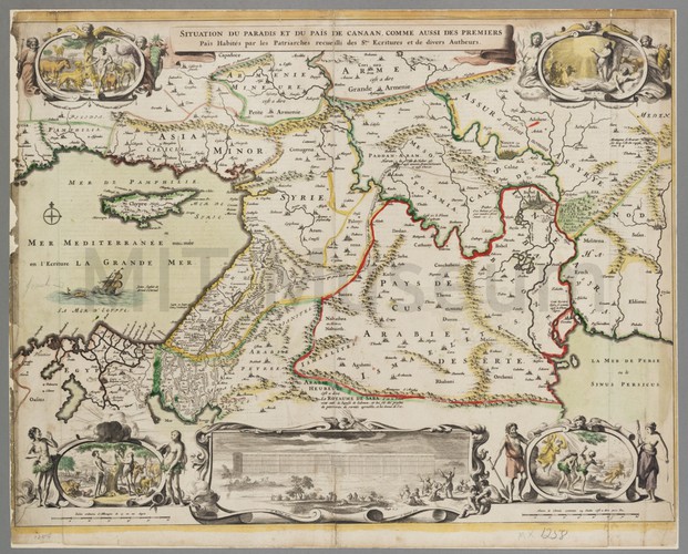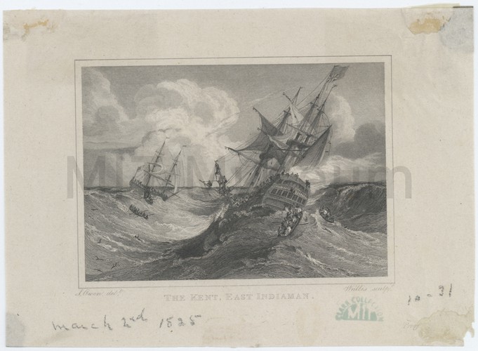 A blue tinted aquatint of the lugger yacht 'Emmetje' off a cliff shore with her starboard side visible. She carries the British White Ensign and a pennant of the Royal Yacht Club. Her square sails and jib sails are full in the breeze. Her owner, Lord Harborough, was said to be so proud of the lugger that he sailed into Ramsgate Harbor flying the pennant of the Royal Navy until an officer pulled it down.