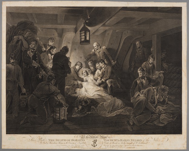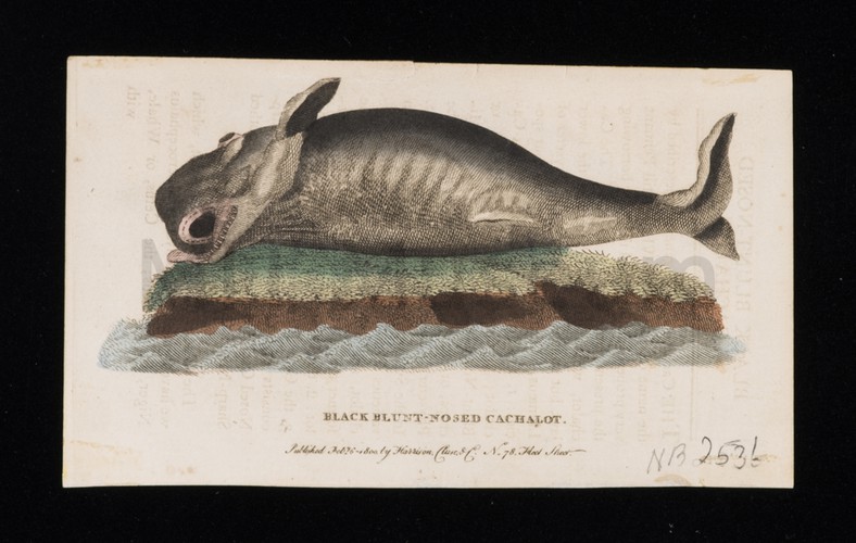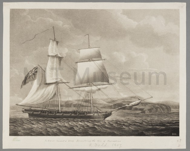 Port broadside view of the 'Harriet' with a shoreline of steep cliffs and a frontal view of the bow of another ship in the background. The print is signed by the artist in plate, inscribed "No. 13" above the title, and is hand-colored. The 'Harriet' was owned by Lord Belfast and raced with success in the late 1820s. She was sold and was no longer owned by Lord Belfast when she won the King's Cup in 1834.