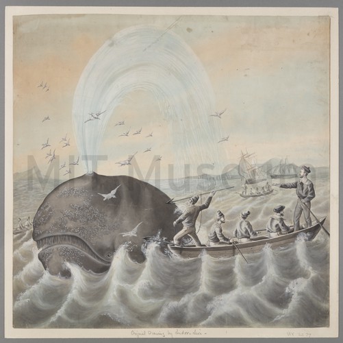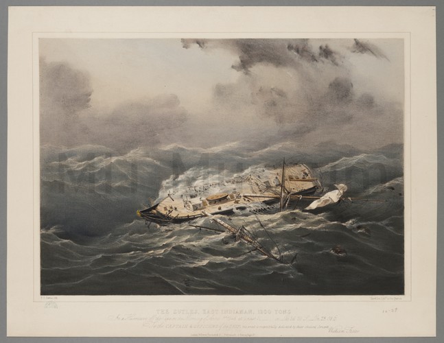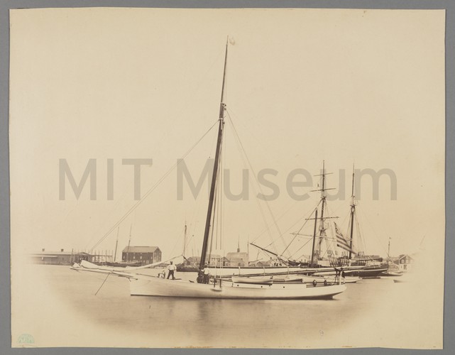 A view of the iron cutter yacht, 'Mosquito,' at sea with several ships and yachts in the distance. The 'Mosquito' was a well-known iron cutter yacht famous for her speed and for winning in prestigious cup races. Her winnings are listed in the margin below the title along with two illustrations of a winning cup.
