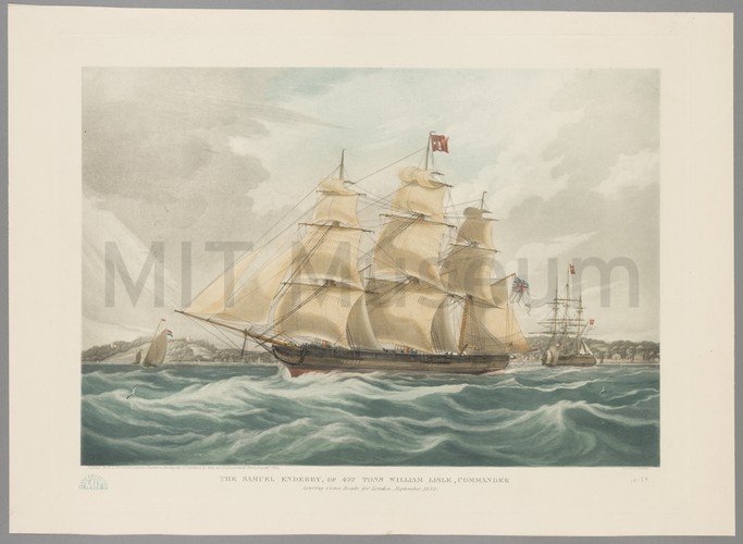 A black-and-white lithograph of the first iron lighthouse at Minots Ledge at one of the Cohasset Rocks. The area was known to be dangerous due to the unmarked rocks that made up a nearly one-mile ledge offshore. Between 1832 and 1841, an estimated 40 wrecks occurred at Minots Ledge. In 1843, the Lighthouse Service recognized the dire need for a lighthouse and recommended an iron-pile structure drilled into the rocks that would offer less resistance to the waves than a stone tower. A cast-iron spider, or capping, weighing 5 tons, the keeper's quarter, and a lantern room were added to the top. This first lighthouse was eventually destroyed during a terrible storm April 16, 1851, killing two assistant keepers. The details of this event are noted in the lower margin underneath the scene.