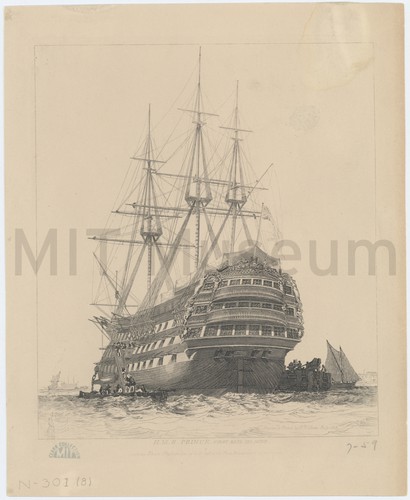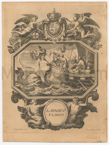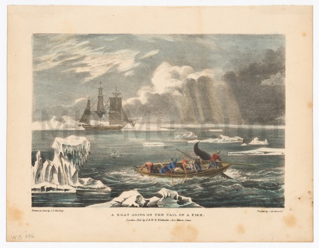 Colored engraving of three boats of blue-coated men surrounding a spouting whale, with harpoons at the ready. In the background are icy islands or icebergs and three large ships. There is a white bear on one of the ice formations. The tail of another whale is visible in the distance. Below the image is the following text, "The Longboats making towards a WHALE, & the Harponiers going to cast their Lances at him."