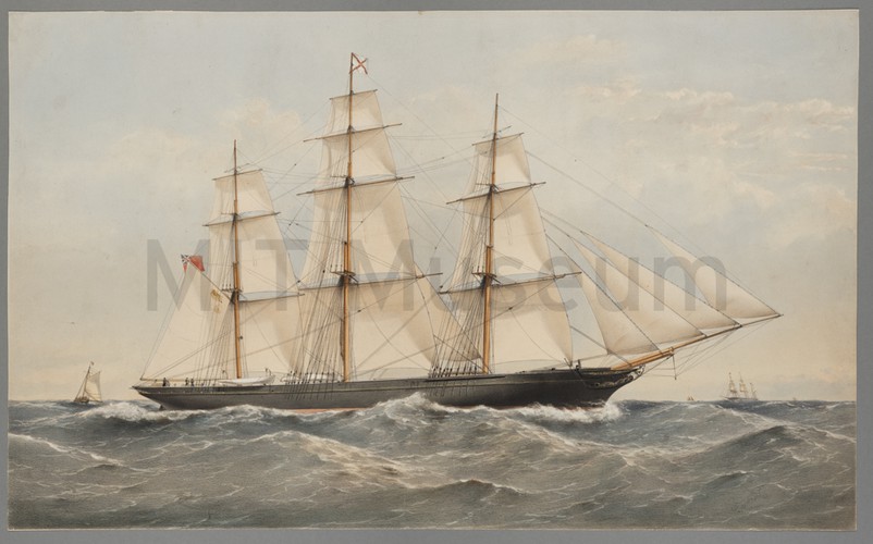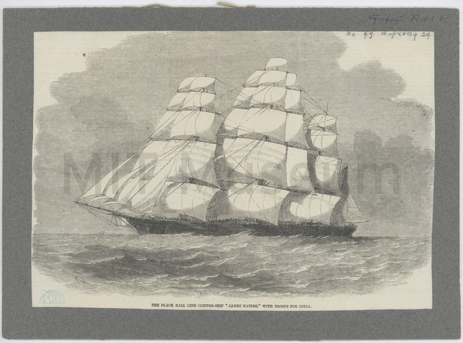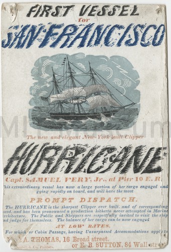 Clipper card for the ship "Charger", departing for San Francisco "on or before Monday, Jan. 5th." Commander Luther Hurd. With a depiction of a company flag and of a calvaryman on horseback.