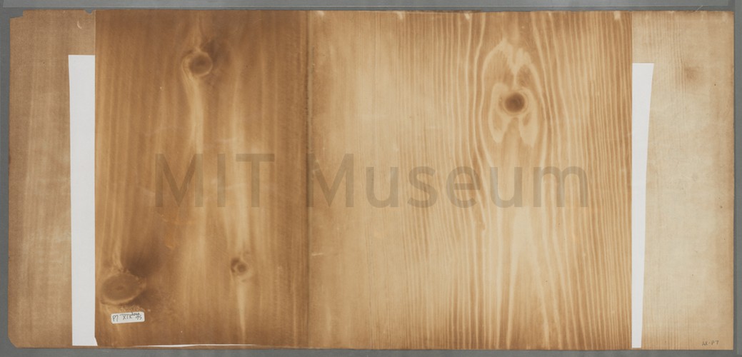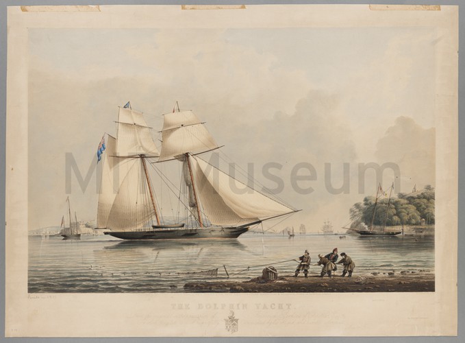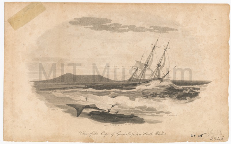 Monochrome engraving depicting a beached male whale, with men measuring its tail, another man on its back raising his axe to cut into the blubber, and two more men climbing up. There is a whaling boat with the harpooneersman about to cast his harpoon into a spouting whale in the background, as well as a sailing ship, and a hilly landmass. Under the image is printed "The MYSTICETUS, or common WHALE. Published by Nuttall Fisher & Dixon 3____339"