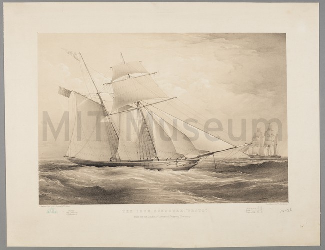 A partially colored engraving showing two narwhal on shore, cliffs and birds to right, two birds to left, rocky cliffs in background.