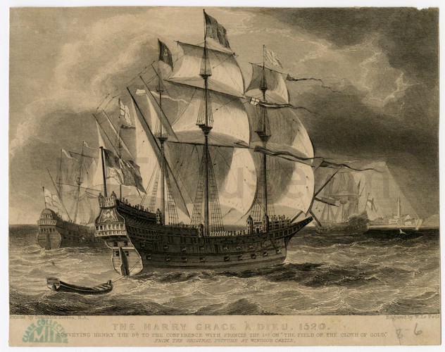 Engraving depicting an Arctic whaling scene. In the foreground, men in whaleboats prepare to strike a spouting whale; behind them are two more whaleboats, one bearing the British flag and with the letters R.D. (probably for Robert Dodd, the draughtsman) emblazoned upon it. Two large whaling ships behind them, one with a French flag and the other with a red flag bearing the Union Jack in the canton. More ships and whaleboats in the background. Title and artist names printed in lower margin.