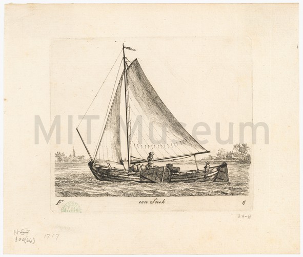 Photograph of a ship on the water. The ship has a single deck of guns and there are two small boats up on davits on her site. Maker/copyright holder name at bottom left.