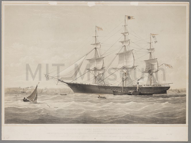 Clipper card for the ship "Ocean Telegraph", sailing for San Francisco to depart on Thursday, 31 July. Willis, master. With a company flag and an image of a ship.