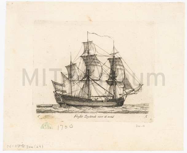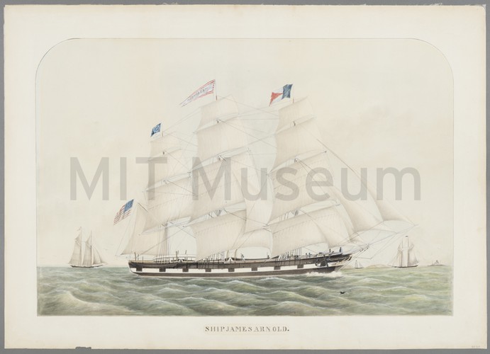 Three-fourths bow view of the Stationer's Barge on a body of water, probably the Thames River. The vessel flies two flags and is full of passengers and rowers. Another ship proceeds to the left of her, and flies a flag with the Union Jack in the canton. In the background is a riverbank with buildings and trees. Title and production information printed in lower margin.