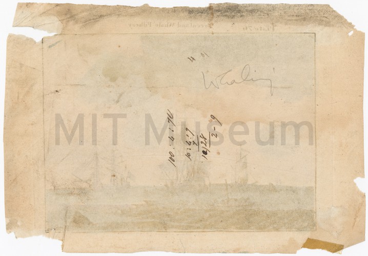 Scene of Blackwall shipyard, in London. The edge of a bank and a bridge stretching over to the opposite bank occupy the foreground, and the far bank, in the background, is populated by builidngs, figures, and moored ships. The closest ship to the viewer, seen in three-quarters stern view, is the "Trafalgar", with her name printed on her stern. At far left in the foreground, three men converse on the bank, two seated and one standing; at right, on the brige, two men pull in a line that stretches out of the frame, perhaps connecting to a boat on the water. Title and production information printed along the railing and side of the bridge.