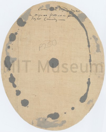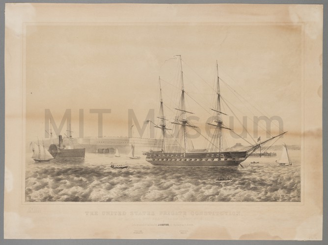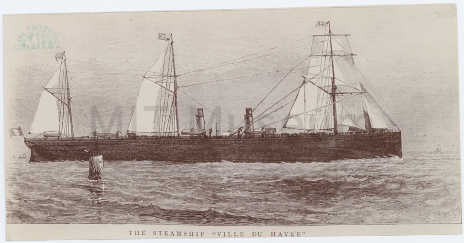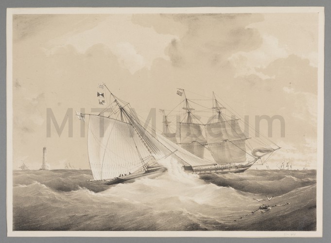 A sepia, photo-processed reproduction print of a painting of the cutter yacht 'Vanguard' by Samuel Walters. She is winning the Majesty's Cup hosted by the Royal Artillery Yacht Club in Kingstown on 19 July 1872. In the background behind her, at least seven cutter yachts trail behind her.