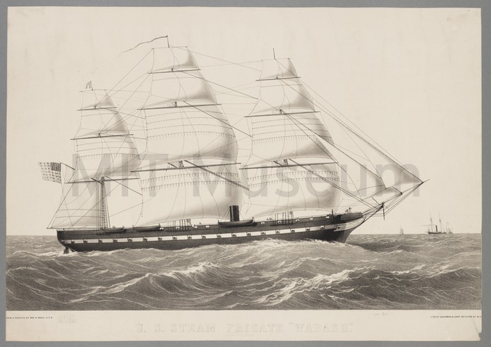 A three-quarter stern and port-side view of the East Indiaman the 'Wellington' sailing off the coast of Dover. As she veers toward the right, she flies a signal. Another three-masted, British vessel floats in the background also flying signal flags.
