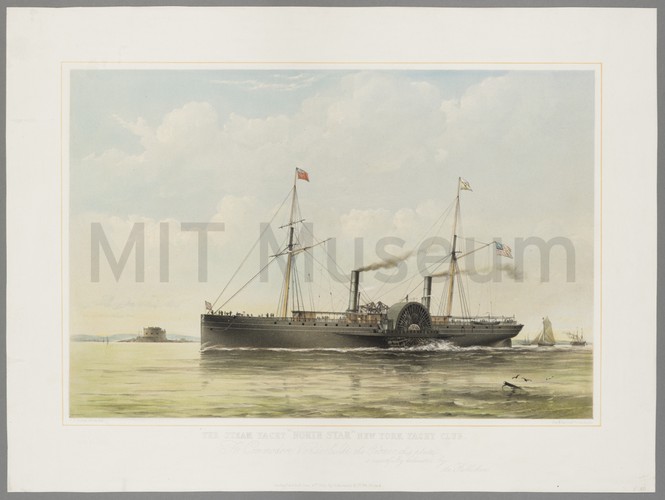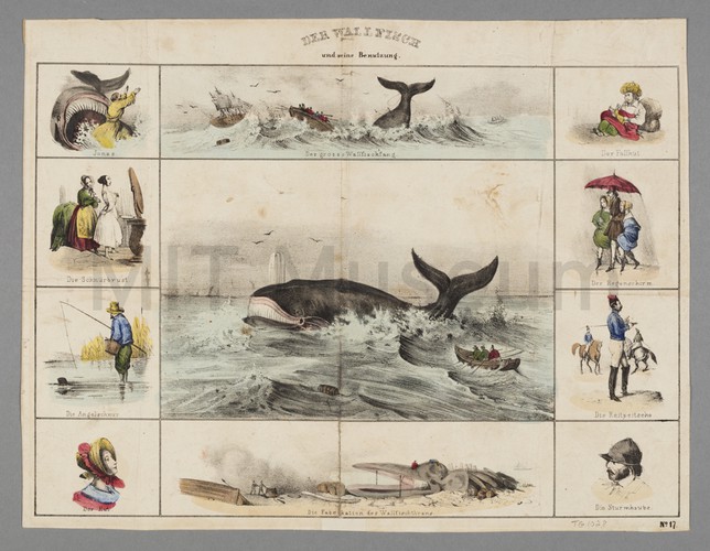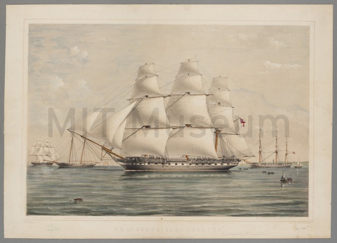 Hand-colored lithograph depicting two whaleboats rowing towards a spouting whale, with a whaleship and a mountainous landmass in the background. Title printed in a box at bottom centre of image. Artist and publisher information, the address "152 Nassau St. NY", and "Entered according to Act of Congress in the year 1852 by N. Currier, in the Clerk's Office of the District-Court of the Southern District of N.Y." printed in lower margin.