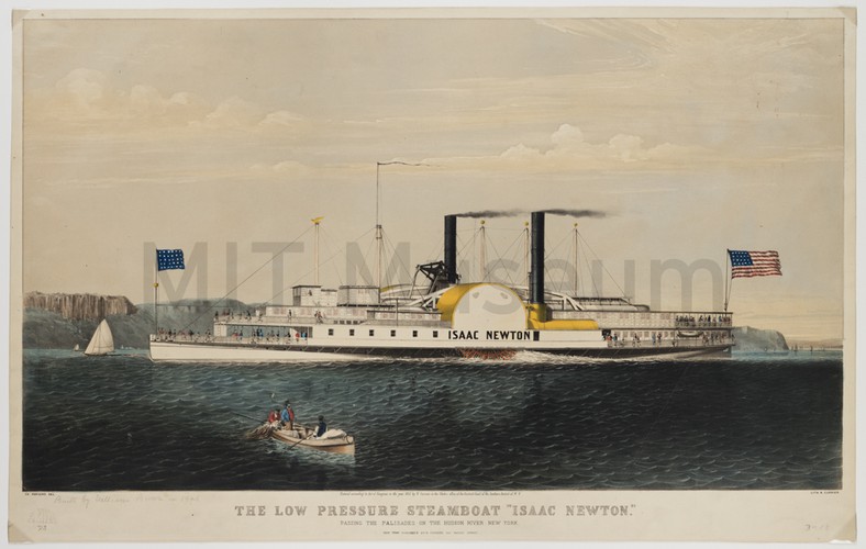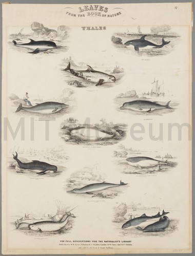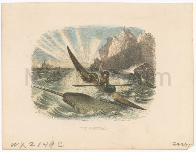 Colored engraving depicting a beached beluga with six stripes around the base of its tail, facing right, on a rocky shore. There is a ship in the background to the left. Title of image is printed below: "THE WHITE WHALE". The colorist has rendered the animal in a blue-green hue.
