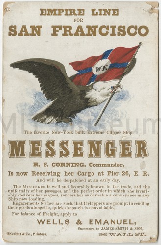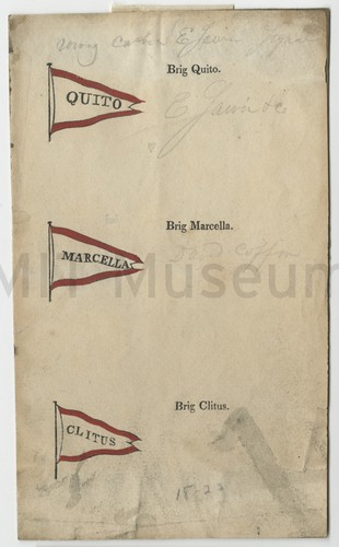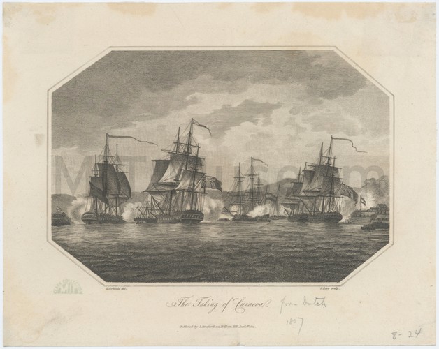 Side view of the royal yacht, the "Royal Sovereign", as she sails out to visit the Russian Squadron, which had stopped in Portsmouth on its way to the Mediterranean in 1827. In the background at left is another vessel and a coastal building; in the background at right is a collection of large ships, likely the Squadron. The "Royal Sovereign" herself is three-masted, and flies a British naval jack at stern and a flag bearing the royal insignia. The title indicates that the Dutchess of Clarence (formerly Princess Adelaide of Saxe-Meningen and later Queen Adelaide of Britain) was on board the "Royal Sovereign".