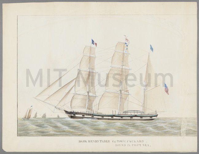 Plate 10 from the series 'Twenty-two prints of several of the capital ships of his Majesties Royal Navy with variety of other sea pieces.' A view of royal naval ships at sea. The ship of the line in the foreground is in profile, port side, with her anchor raised and sails lowered. Other ships sail in the distance. At the left is a coastline with a castle with crenulated roofs and a town. Underneath the image is the dedication to "Josiah Burchett Esqr" and the production detail, "TBaston delin / J. Harris Sculp."
