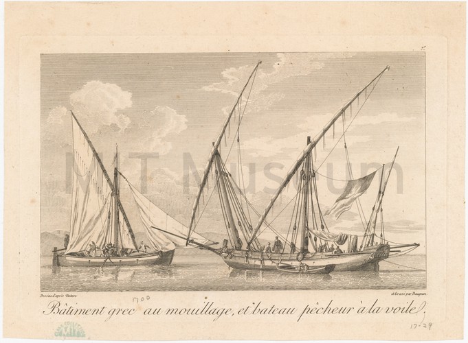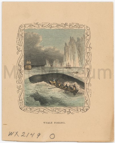 A view of Peterhead Bay in the early nineteenth century. The natural harbor is busy with maritime activity. Ships of the British Naval services, indicated by their ensigns with the Union Jack in the canton, anchor in the safety of breakwaters. Whaling, fishing, and shipbuilding were active industries of the town, and masts fill up part of the city's skyline where the shipbuilding dockyard was located. In the foreground are shoals in which men in top hats and their dogs sit or partake in recreational sailing activities.