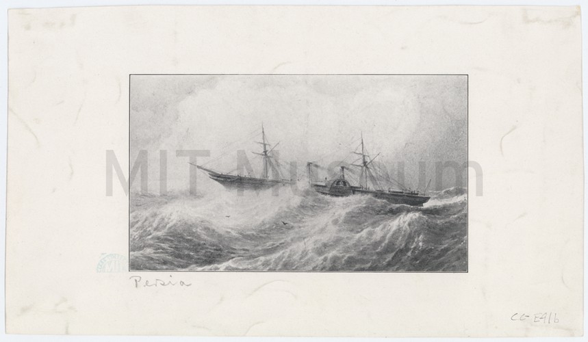 On the reverse is an incomplete and quick graphite sketch of a vessel's hull, foremast, bowsprit, yards, and some faint indications of rigging.