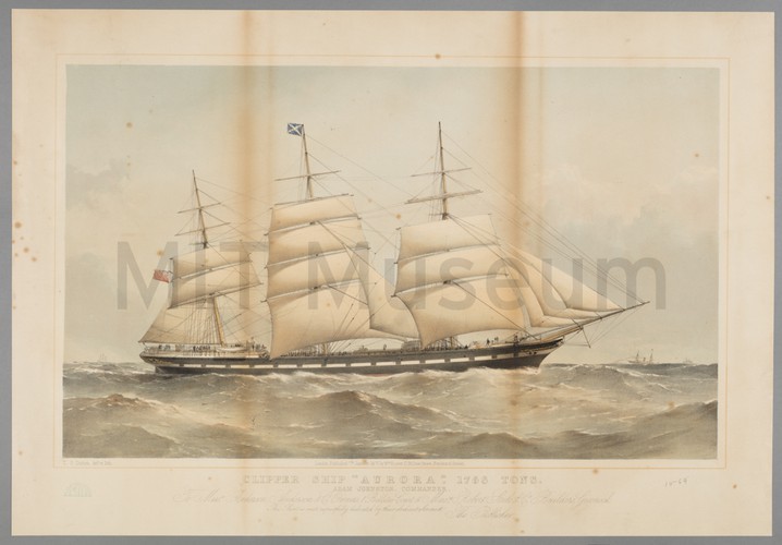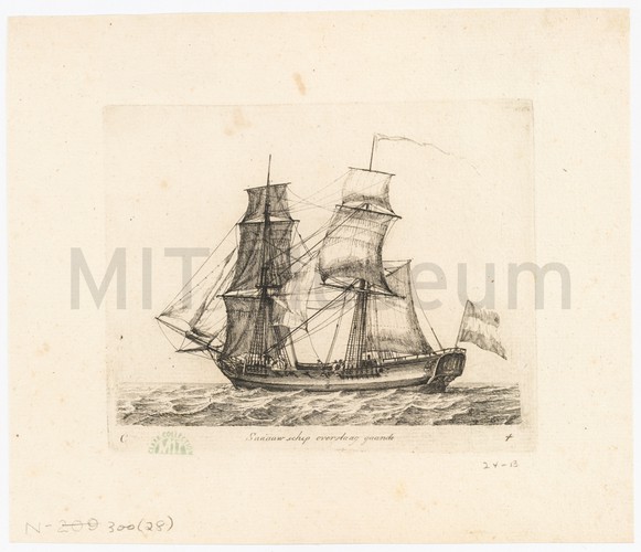 A hand-colored lithograph of the RYS Brig 'Water Witch' and the HMS ships 'Vernon,' 'Castor,' and 'Snake' of the Experimental Squadron off the Scilly Isles in a trial. The fleet organized in 1832 was headed Vice-Admiral Sir Pulteney Malcolm in order to test the rates of sailing of various new types of vessels. In the print, the 'Water Witch' is depicted as the largest ship in the left side of the print. The other HMS vessels are in the distance.