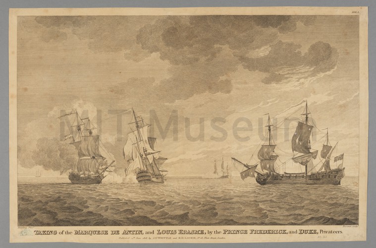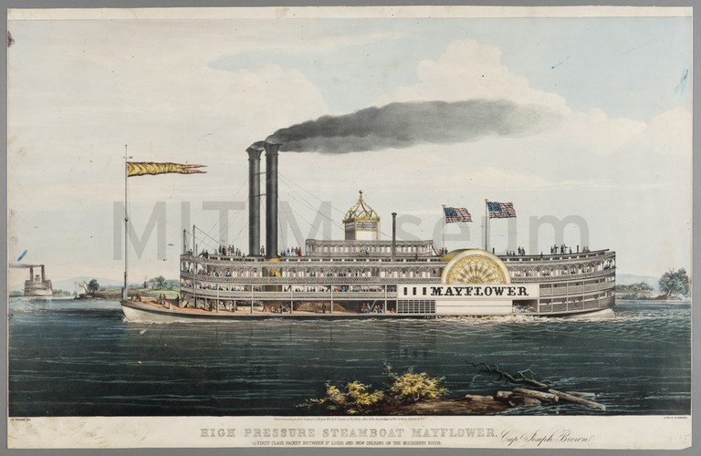 Starboard view of the paddle steamer "Fulton" (1838), with other ships visible on the horizon. The Fulton flies an American flag, and her sails are furled. Title and artist attributions printed in lower margin, along with "Engraved for Stuart's Naval and Mail Steamers, U.S."