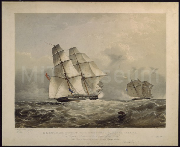 A port-broadside view of the USS 'Wyoming' in still waters with all of her sails furled. She flies an American flag above her stern. W. A. K. Martin painted this portrait one year after she was launched in Philadelphia.