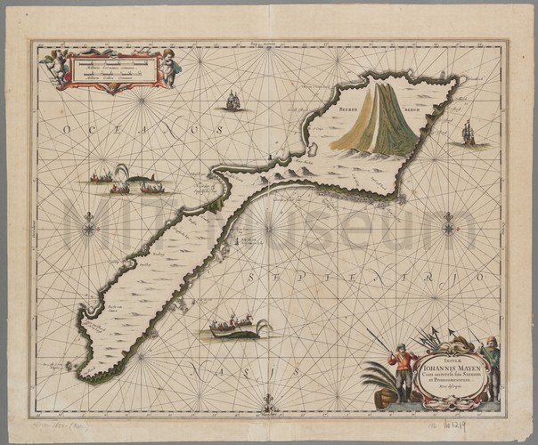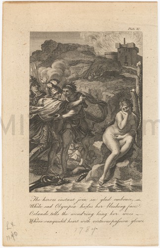 Uncolored engraving on thick laid paper, showing a nude figure dancing in the sea, holding a swathe of cloth forming a circle, with cherubs nearby. With an elaborate border that includes nude female figures and two chimeras with human upper bodies and the tails of sea serpents. Whale-like creature at bottom left; horse at bottom right. Printed in lower margin, "le Potre fecit cum privil."