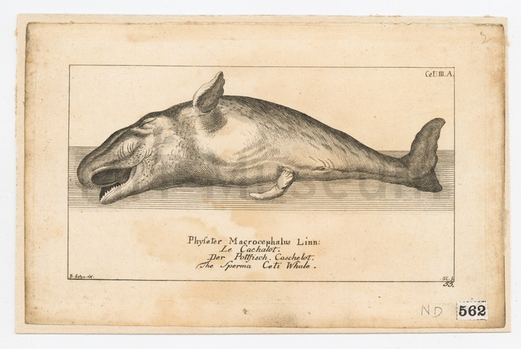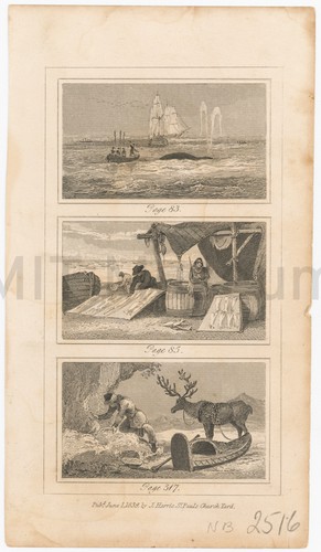 Colored engraving of whales being harpooned by whaling parties form small boats launched from larger ships, in Arctic waters; polar bears on ice flows in foreground, and a walrus being shot. In distinctive decorative border, from George Henry Millar's 'The new and universal System of Geography, being a complete history and description of the whole world. ...'