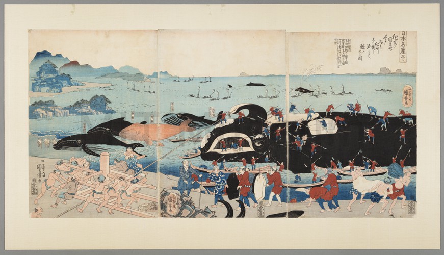 Hand-colored vue d'optique print depicting the harbor in Boston, Massachusetts. When viewed through a device, the image had the illusion of depth. Perspective prints were popular in the early eighteenth century. Two ships are at anchor and British soldiers and men work to unload merchandise on the shore from the ship at the left. It is an idealized view depicting Boston as a typical European city. The text at the bottom is in German and French.