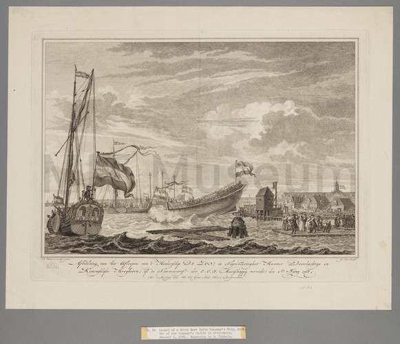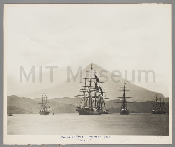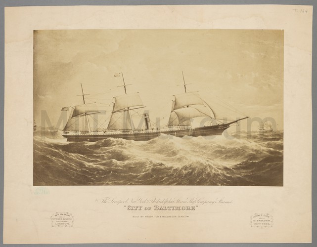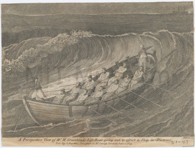 A colored lithograph of a weather quarter view of a cutter yacht close hauled. Her sails are full and by, or lying as near as possible. In the left background is a vessel that is sailing downwind with the sails.