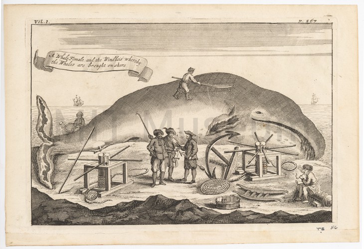 Hand-colored print depicting a baleen whale, facing right with its mouth partially open, beached on a small patch of land in the sea. In the background is a whaling scene and high icebergs. The whale has a prominent double blowhole atop its head. Labeled "WHALE FISHERY." and "Page 70."
