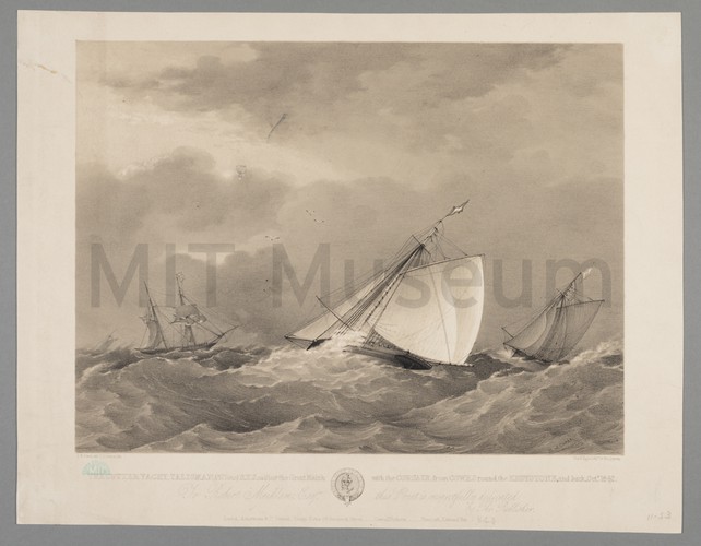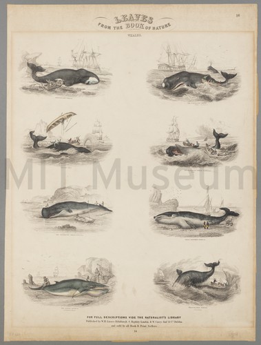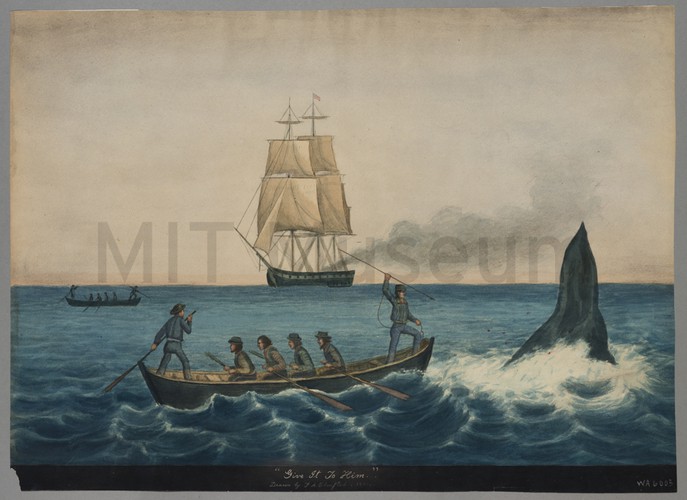 Uncolored lithograph depicting, at right, a sperm whale capsizing a whaleboat with a sail and splitting it apart; one sailor is floundering in the water, one is about to fall in, and two others cling to the spars of the whaleboat. The whale has been harpooned on its snout. At left, in the background, is a three-masted whaling ship. Title and publisher information, including the address "125 Nassau St. New York", are printed in lower margin.