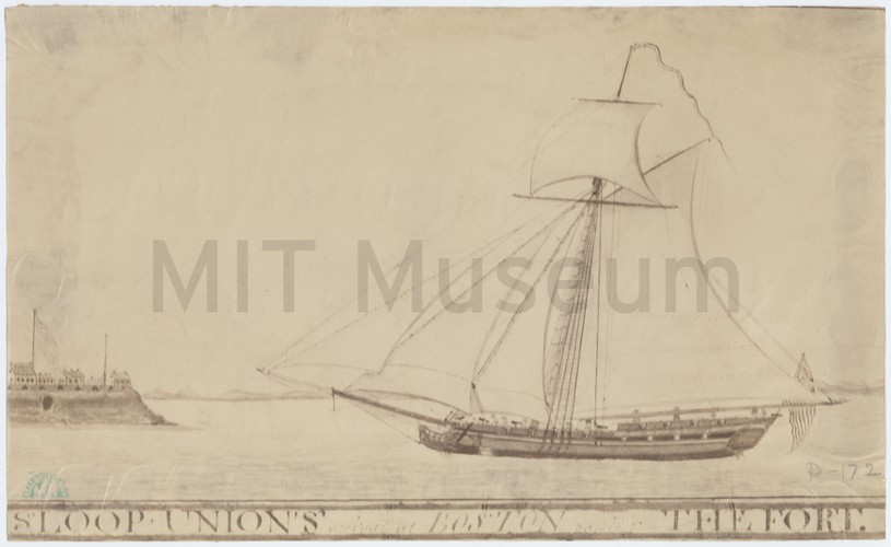Hand-colored print on laid paper depicting an Arctic whaling scene. In the bottom right corner, two men shoot a walrus on a patch of ice while another prepares to club it. In the bottom left corner, four men attack a polar bear, drawn with a boar-like snout, with lances. There are numerous whaleboats on the water. Three, in the central foreground, surround a spouting whale with their harpooneersmen preparing to strike. In the right-hand background, the harpooneersmen of three other boats attack another whale. There are three ships visible; the closest flies a red flag with the Union Jack in the canton. A fourth ship is discernable in the far left background and three or four more in the central background, drawn faintly. Between the two largest ships is a float of ice with a polar bear upon it. Icebergs and cloudbanks line the horizon line. The rays of the sun come out from behind a cloud.